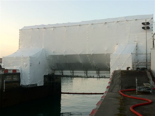 Le film positionné grâce à une gamme complète d’accessoires est alors chauffé à l’aide d’un pistolet. Sous l’action de la chaleur, le film se rétracte pour se tendre, les laizes entre elles se soudent, le tout formant une paroi solide pour créer un environnement complètement fermé « hors d’eau, hors d’air, hors de poussière ».